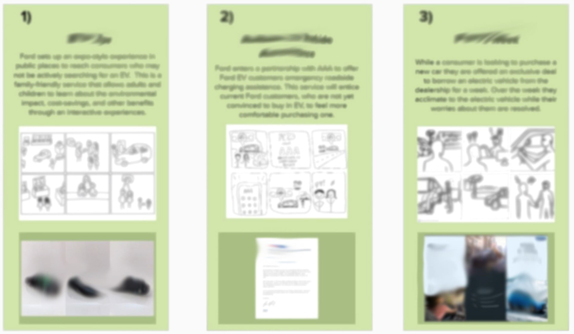 My responsibilities included conducting user interviews, storyboarding our concepts, creating service artifacts, and making our final presentation/pitch to Ford.